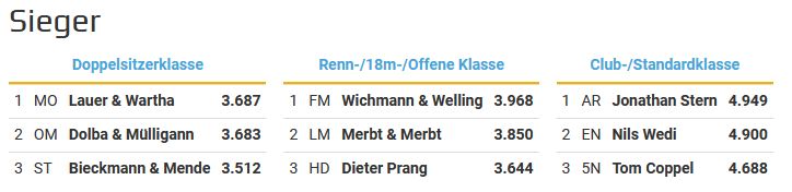 - Es wurde mit 31 Flugzeugen an 6 Wertungstagen 149 Flüge durchgeführt. Davon sind 126 ins Ziel gekommen. Es gab nur 2 Außenlandungen auf einem Acker und keine auf einem anderen Flugplatz.